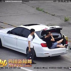 记者从这段三分多钟的视频里看到:在成都收费站进站方向客车检查点外的禁停区内,停靠着一辆宝马车,车上下来几个男男女女,摆出各种POSE自拍,其中一名男子打开后备箱,坐了进去,摆出一副类似“美人鱼”的造型,并借来一副墨镜戴上,引来同伴们的一阵闪光灯。