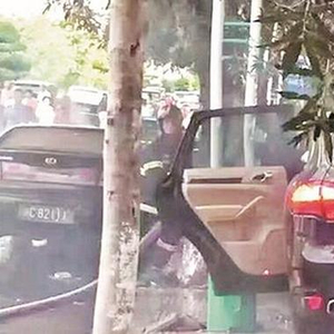 昨 天上午8点10分,石狮消防部门接到报警后,派出了2部消防车和12名官兵赶往事故现场救援。当时一名女子躺在保时捷轿车左侧车轮旁,轿车已经开上了路边 的绿化带,右前侧正在燃烧。离保时捷大约10米的前方,一辆摩托车正猛烈燃烧,并且引燃了另一辆轿车,浓烟笼罩了整条马路,气味刺鼻。