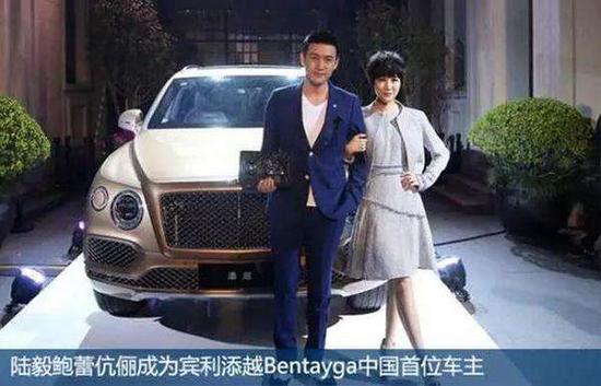 2016年4月份,陆毅与鲍蕾正式提车,顺利按下这款沙漠铜色的首发限量版宾利添越,成为国内首位获得这款车的车主。值得一提的是,这款车在中国市场仅限量55辆,裸车价达到400元,相当名贵、豪华的车。