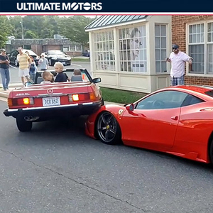 事故发生在美国维吉尼亚州Great Falls一间咖啡厅举办的Cars & Coffee活动上,梅赛德斯-奔驰380 SL的车主想要将他心爱的经典车,停在价值40万美金的法拉利458 Speciale前方,可惜一时失足酿成大错,直接骑到了458车头上。