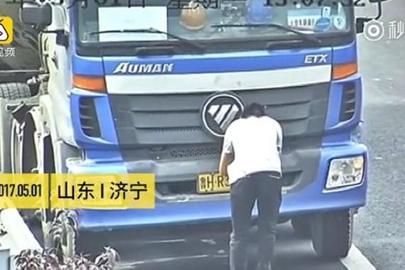 一大货车司机察觉前方收费站有交警查超载超限,将车违法停在匝道,边观察监控摄像头边拿抹布遮挡号牌,还下车跑到收费站确认交警在检查,随后径直倒车。