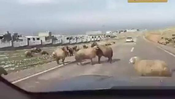 两只羊马路中间决斗,丰田汽车横穿决斗现场