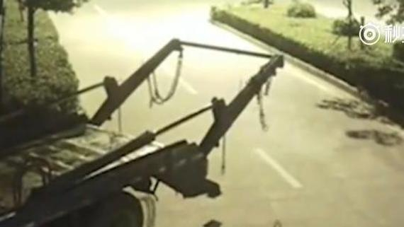 疾驶的电动车经过倒车的垃圾车后方时,被铁链锁喉,过路行人在经过货车后方时,更要多加注意..