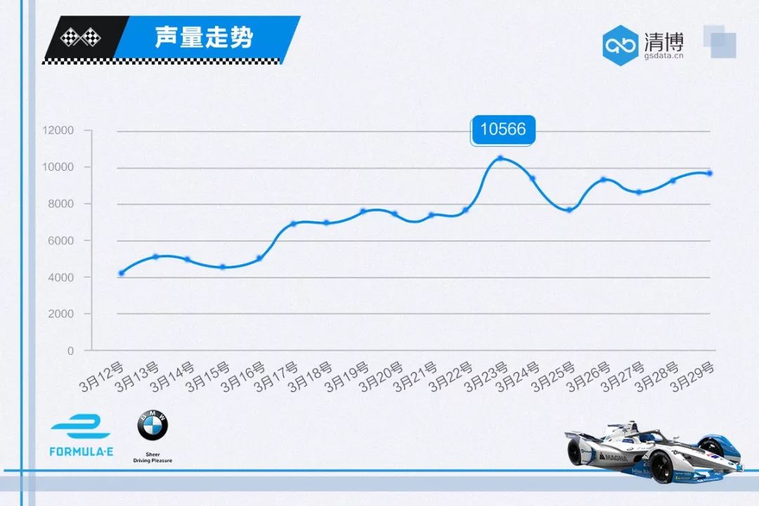 声量走势向来都是最能直观反映流量变化的数据指标之一。如图所示,3月19日前,BMW品牌声量整体平稳且表现出小幅度的下降趋势,自19日开始预热后,BMW相关声量走势表现出良好的增长势头,且在23日达到峰值。FE三亚站落幕后,新浪发布赛事总结相关内容继续带动关注目光,使BMW声量依旧保持高位运行。