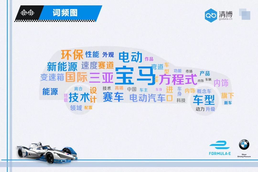 通过对其进行词频分析,热门主题词中“环保”“新能源”概念凸显,证明BMW借此赛事,通过整体、连贯、多方位的运营策略,展现了其新能源车型的亮点,也体现了本次活动为BMW进军电动车市场实现了有效铺垫。