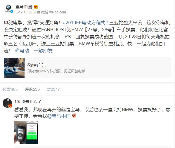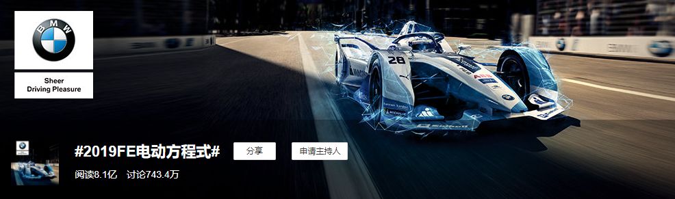 BMW是2019国际汽联FE电动方程式的赞助商,在FIAFormula E主持的官方话题#2019FE电动方程式#中,通过锁定话题头像、题图、导语、PC端话题页左右两侧iframe、推荐微博处亮明品牌标识等用户浏览路径,对BMW权益信息进行全面曝光。