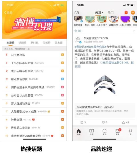 当然,在传播推广中,媒介资源也是除内容外至关重要的一环。此次东风雪铁龙就有效组合了新浪微博精准型广告与创新型广告资源,对内容进行传播。一方面通过热搜话题和品牌速递有效触达用户,以新浪优质项目强势提升车型曝光与品牌活动声量,收获总曝光超过五千万。