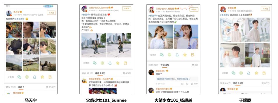 春游过程中的美丽景色和动人风情,刺激网友在微博上分享自己美好的春游旅记。当然,其中不乏明星的参与。马天宇、杨超越、Sunnee、于朦胧等流量明星现身说法,分享自己的春游季出行活动,成为#春游季#热度的“引信”,点燃了大量粉丝网友关注话题,并主动跟随发布博文的激情,使话题热度居高不下。
