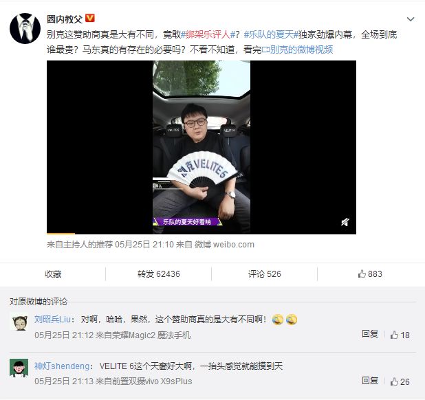 别克借势明星人气和节目热度,收割了一波流量,包括@老狼 、@吴青峰 、@鹦鹉史航 等各界大V在社交平台上自发对节目进行“安利”,这些“安利”中的视频链接与官方宣传海报都使别克VELITE 6增加了品牌展示机会,加深品牌好感度,培养购买倾向。