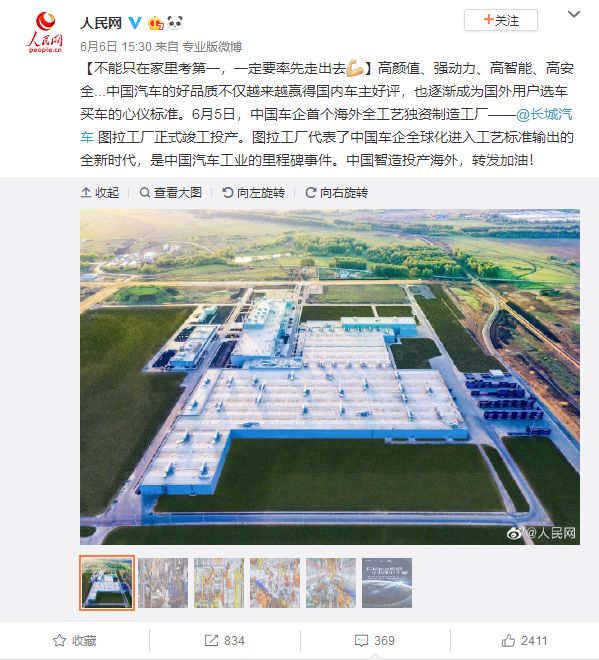 @人民网 发布对长城汽车图拉工厂投产相关微博言论称:“不能只在家里考第一,一定要率先走出去。”高颜值、强动力、高智能、高安全...中国汽车的好品质不仅越来越赢得国内车主好评,也逐渐成为国外用户选车买车的心仪标准。图拉工厂代表了中国车企全球化进入工艺标准输出的全新时代,是中国汽车工业的里程碑事件。