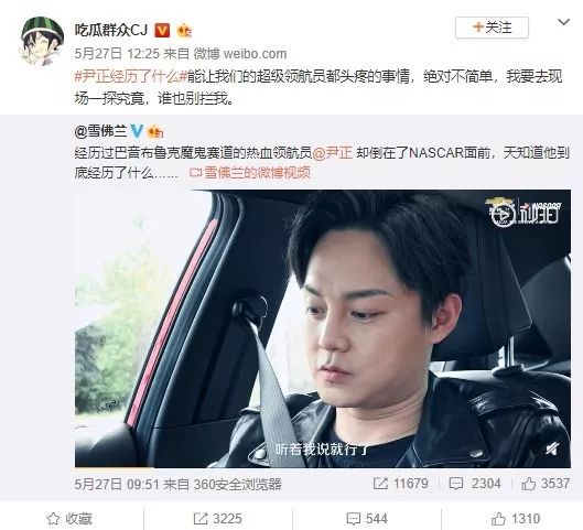 之后,雪佛兰选择微博进行头部传播、集中造势,用#尹正经历了什么#的热搜话题引流,设置悬念,隐晦突出尹正面临的挑战难度,激发网友的好奇与联想。@追星狂魔、@吃瓜群众CJ、@东邪西媚 等娱乐大V纷纷带上这个话题,打着娱乐的旗号,转发试驾内容,揭晓尹正作为超级领航员面对素(fen)人(si)挑(jian)战(mian)时的精彩表现,进一步助力话题发酵,在短时间内即斩获大规模关注。