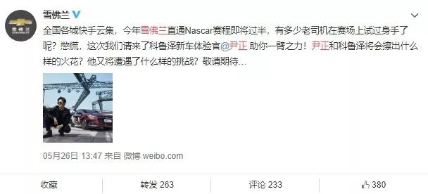 励志喜剧电影《飞驰人生》在大年初一热映后,@尹正 饰演的专业、热血、极具运动精神的赛车超级领航员令人印象深刻,但其最终却未能坐上副驾驶跑完魔鬼赛道,成为影迷心中的遗憾。此次曾39次摘得NASCAR赛事年度冠军车队头衔的雪佛兰,大方官宣尹正为直通NASCAR2019光速挑战赛的体验官,为其配备兼具时尚运动外形与不俗动力的科鲁泽作为战车,实力书写为冠军而战,恰好填补粉丝心中的那份遗憾,也瞬间燃起了网友对尹正“无剧本”实地领航的期待,激动大呼:“看不出来雪佛兰也是尹正的死忠粉呢”。