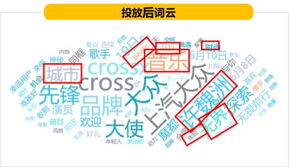 此次大众联合新浪微博、全民K歌举办的“一起唱更出色”的活动成功提高了新车声量。投放后大众T-Cross的词云突出了“时尚年轻音乐”活动特点,加强T-Cross“城市无界”理念,“beats、耳机、音响”车型功能亮点具象化,绑定“许魏洲、KTV”等活动明星内容,软性植入,车型全面深入人心。品牌活动阅读量、提及量及互动量得到跃进式提升,实现品牌影响力扩散。