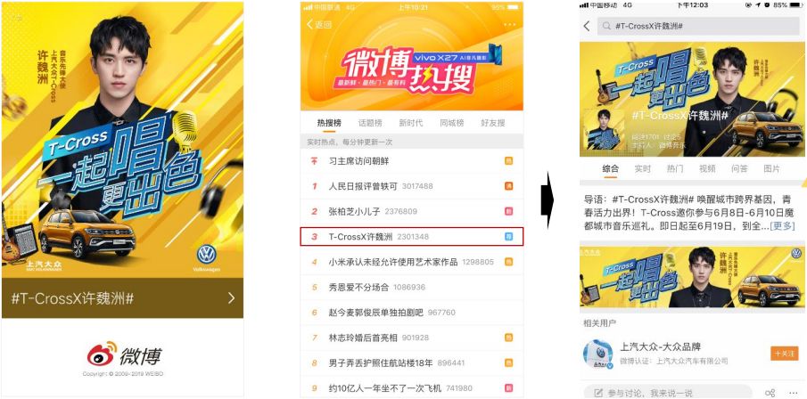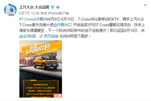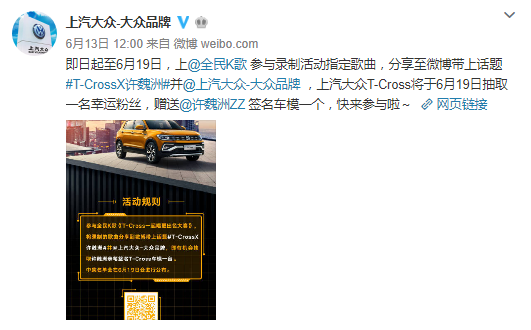 6月6日,大众官微@上汽大众-大众品牌 发布许魏洲成为T-Cross音乐先锋大使,上线话题#T-CrossX许魏洲#,并宣布去全民K歌参与许魏洲合唱指定曲目活动,就有机会获得Beats耳机等神秘好礼!