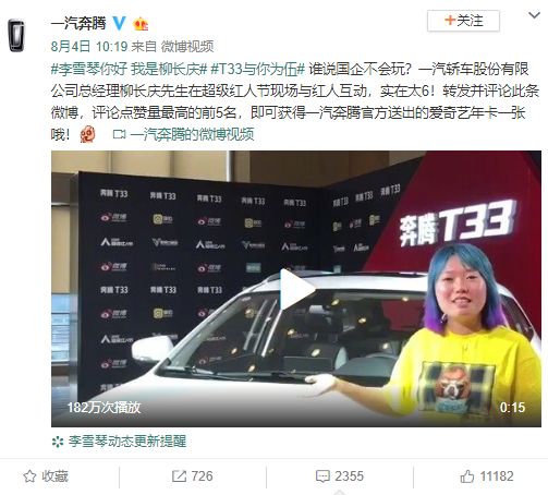 此次,奔腾T33与李雪琴合作,为出道做全面准备,在新浪超级红人节暨奔腾T33上市发布会,一汽轿车股份有限公司总经理柳长庆与李雪琴在活动现场喊话互动:“李雪琴,你好,我是柳长庆,你看这辆奔腾T33帅不?”转眼间,#李雪琴你好 我是柳长庆#就登上了微博热搜,阅读量在不到24个小时内迅速突破1.2亿,收割了一大波热度。