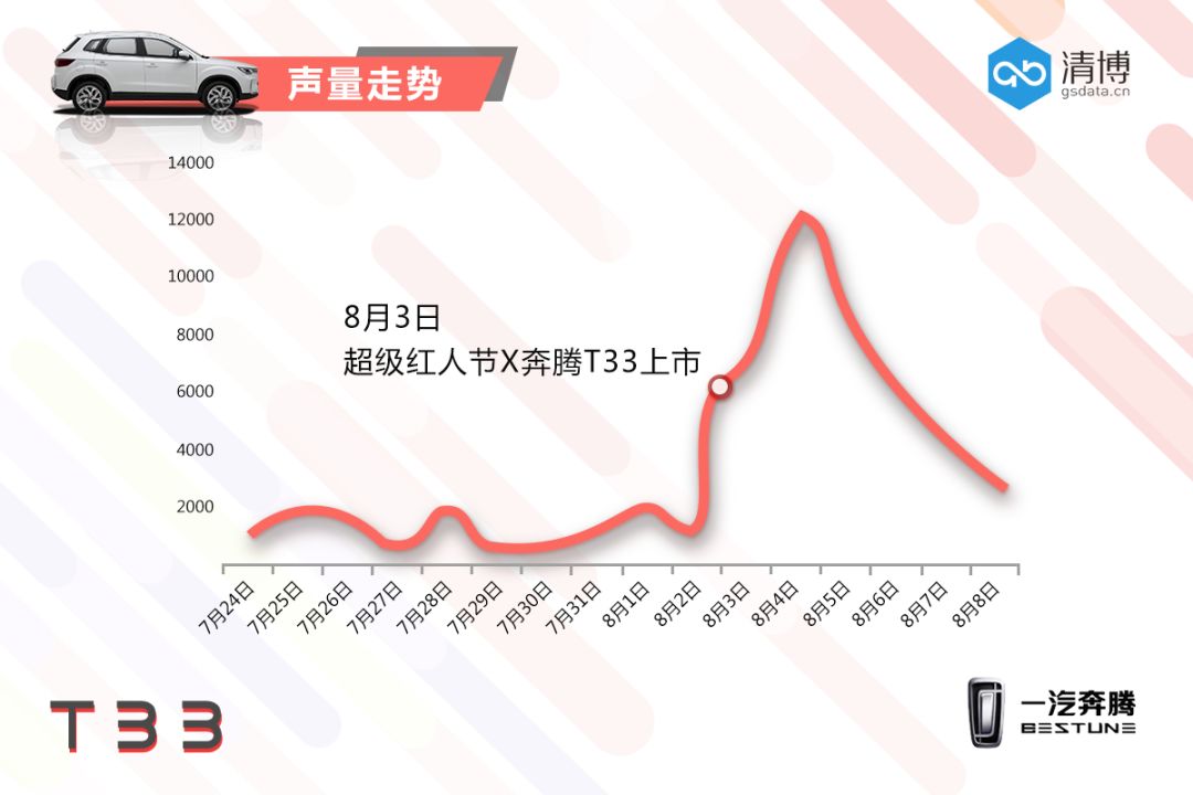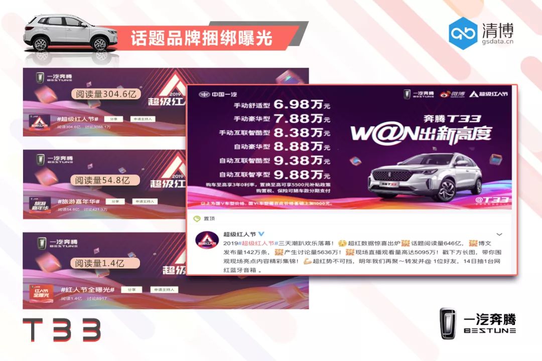 一汽奔腾T33的网红进阶之路可谓是步步成功,最终以新一代网红的身份顺利进入年轻消费者视野。潮流话题页面占据C位,成功定位品牌年轻化;企业高管喊话网红,利用KOL影响力收获极高关注度;线上抽奖不停转,调动网民参与热情,助推奔腾T33收割海量流量。此次一汽奔腾跨界营销姿态够“潮”够“青春”,最终成功狙击青年消费群体。