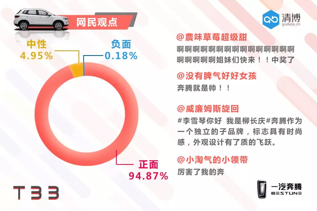 当然了,具备流量和借势炒作都只是成为一个网红的开始。要做一个不过气的网红,最重要的还是“内容”硬核。在新浪超级红人节上,奔腾T33正式发布上市,TA不仅具备“持靓行凶”的高颜值,其智能网联系统这项技能也堪称吸粉万千。网民正面情绪占比高达94.87%,纷纷表示要娶了奔腾T33当“老公”/“老婆”。