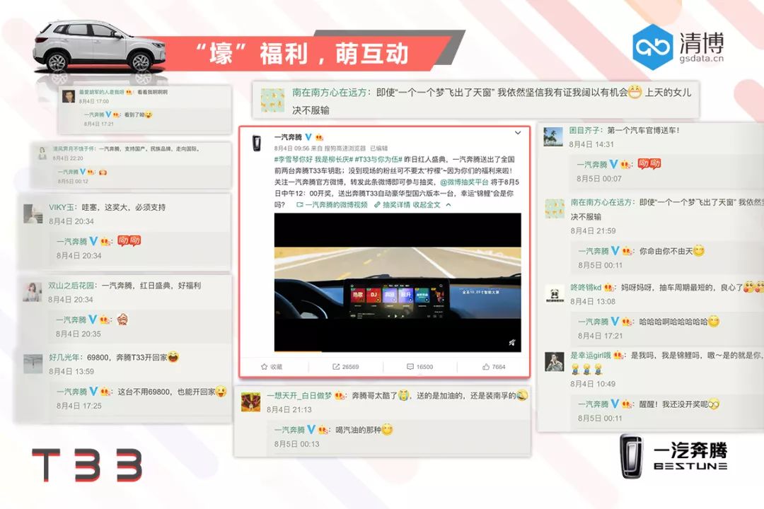 在新浪“超级红人节”上,一汽奔腾实力演绎如何“宠粉”,不仅在发布会现场送车,还玩起了线上抽奖送车的大招,8月4日,@一汽奔腾 官方发布“关注一汽奔腾官方微博,转发此条微博即可参与抽奖,送出奔腾T33自动豪华型国六版本一台”,后该条微博引起转发狂潮。更有趣的是,@一汽奔腾 实力卖萌,为拉近与粉丝间的距离,在该微博评论下一一回复网友留言,潮词金句频出,如@是幸运girl哦 评论,“是我吗?我是锦鲤吗?嗷~是的就是你,来提车吧,好的谢谢。”@一汽奔腾 则回复到,“醒醒!我还没开奖呢!”让人忍俊不禁,深入年轻圈层的潮流之中,在情感互动中收获年轻人群的认同,一汽奔腾这次娱乐跨界营销“玩法”,带给年轻人有趣、新鲜的互动体验。