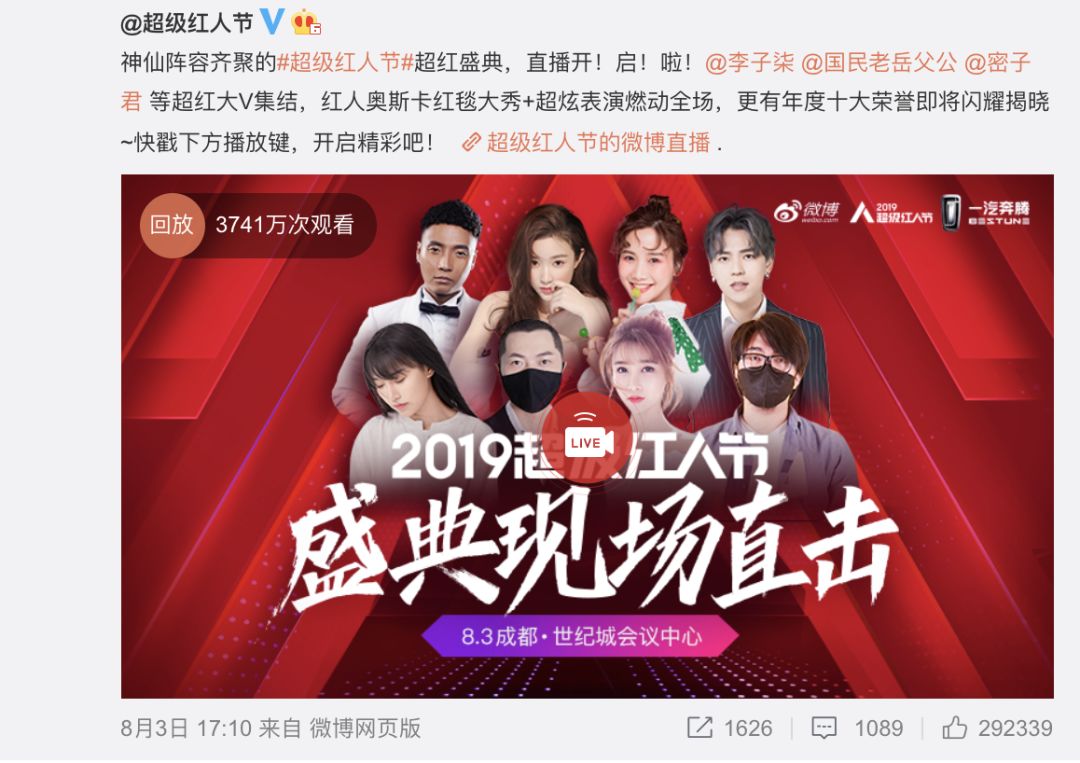 获得网友好感度,还要做到持续的曝光,强势霸占眼球。8月3日,微博账号@微博直播 直播盛典,观看总人数达3741万。直播中,奔腾T33作为摆渡车负责接送各位红人频频亮相,ta与各位网红的合影也进一步提高了奔腾T33的认知度。
