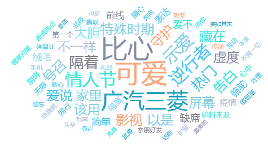 同时,比心表白传递祝福也激发了社会正能量释放,活动后广汽三菱的关键词云中新增了“逆行者”、“可爱”、“比心”、“守护”等暖心词汇,强化了品牌的公益形象。