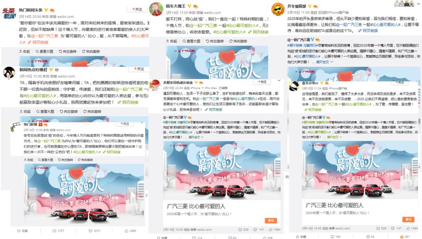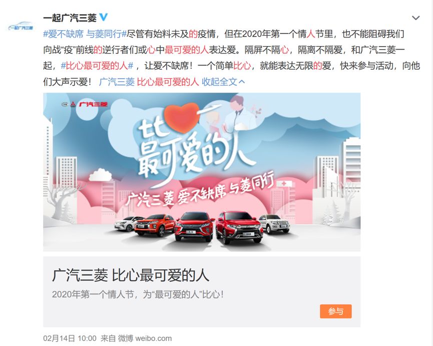 2月14日,@一起广汽三菱 发布活动微博,带话题#比心最可爱的人#号召用户向战“疫”前线的逆行者们或心中最可爱的人表达爱。守护在前线的逆行者是可爱的人,每天换着法子逗你笑的是可爱的人,陪你宅家发胖的也是可爱的人,即使相隔两地也要大声传达爱意!