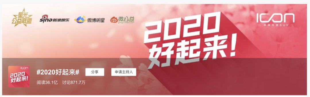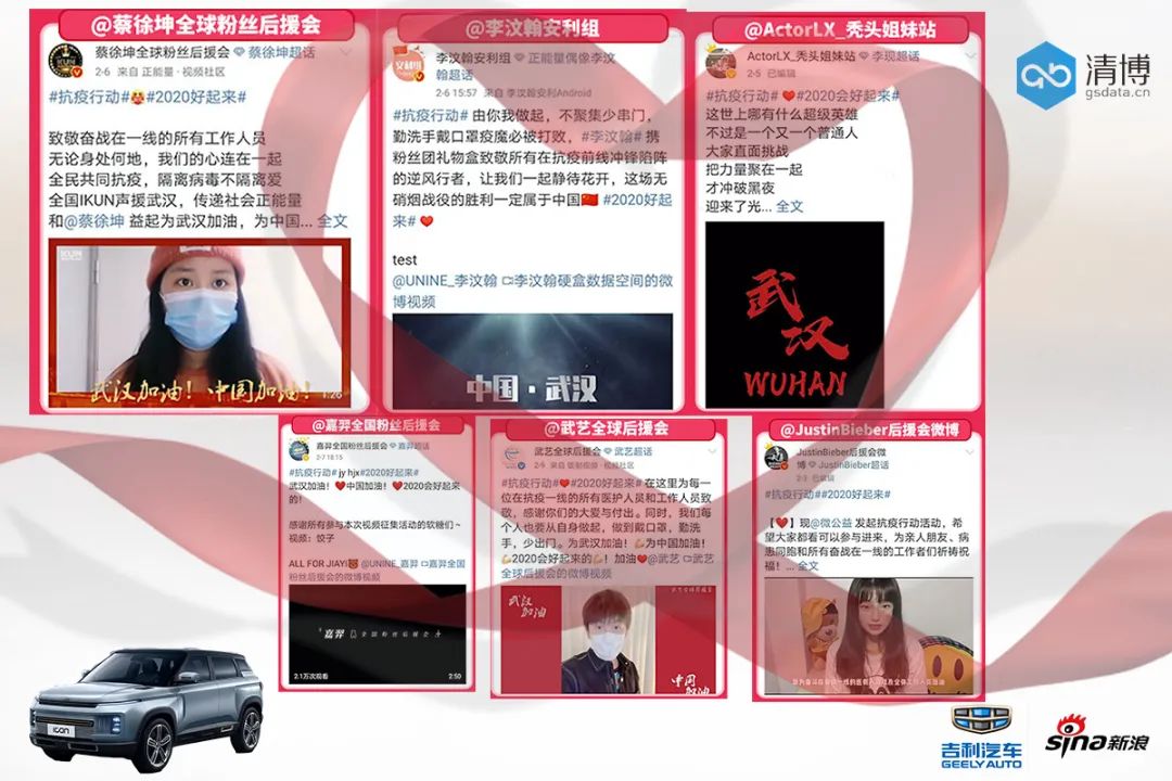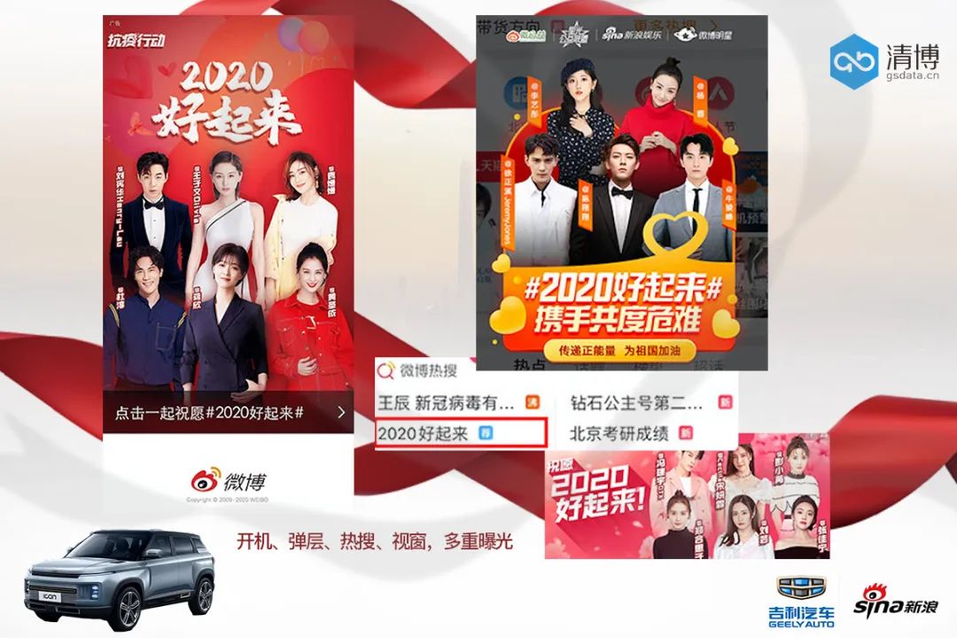 吉利ICON除发布话题号召众多明星为武汉加油,更是充分调动开机、弹层、视窗、热搜等多种微博可视资源,加强#2020好起来#话题的曝光度,传递正能量,为祖国加油,增添品牌好感度。