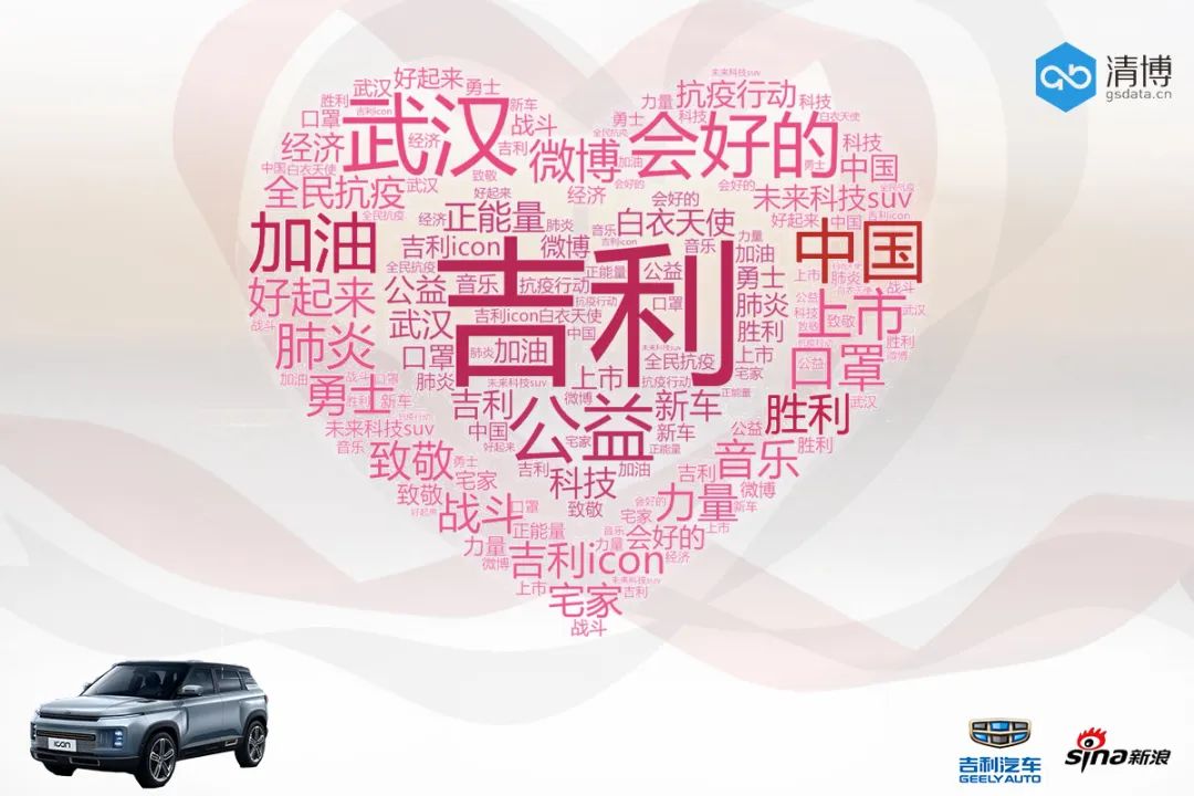 从明星到大V,从粉丝到吃瓜群众,从线上到线下,“2020好起来”公益活动的影响力是巨大的。从网民提及高频词来看,“吉利”与“公益”密不可分,在特殊时期为吉利树立了正面的企业形象;“武汉”“会好的”“加油”“胜利”,体现出“2020好起来”公益活动”的切入点契合群众的关注点,也凸显全国人民对抗击疫情的坚定信心;“吉利ICON”“上市”“新车”“科技”等词的关联讨论,说明在公益活动获得巨大流量同时带动潜在消费者对于吉利ICON关注度的飙升,吉利ICON车型、技术亮点、上市时间也被同时关注讨论,对其上市起到了积极的影响。