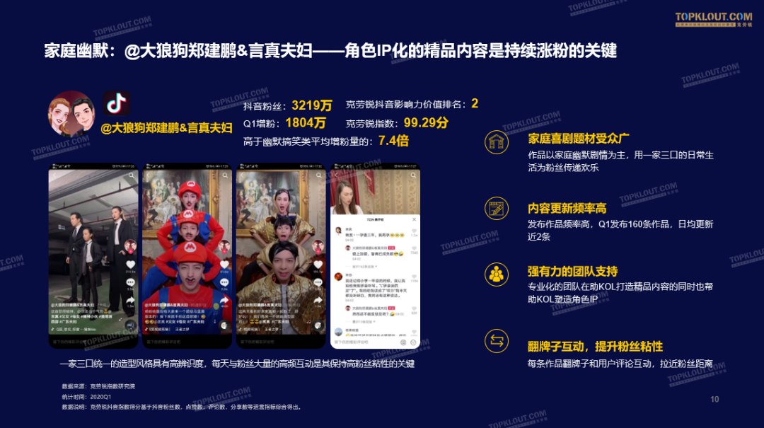 抖音在Q1涨粉量最高的KOL是@大狼狗郑建鹏&言真夫妇,在3个月里涨粉量超过1800万。