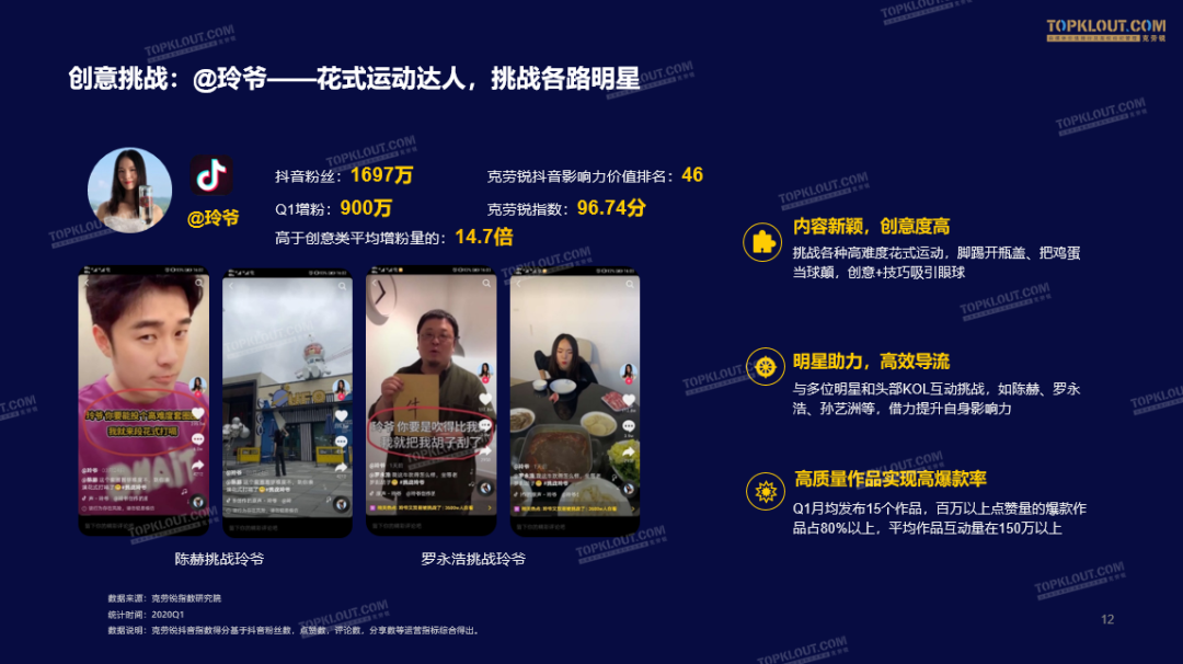 四处挑战明星、名人的@玲爷,用高难度的创意挑战迅速火遍抖音平台,也助力其Q1大幅涨粉。