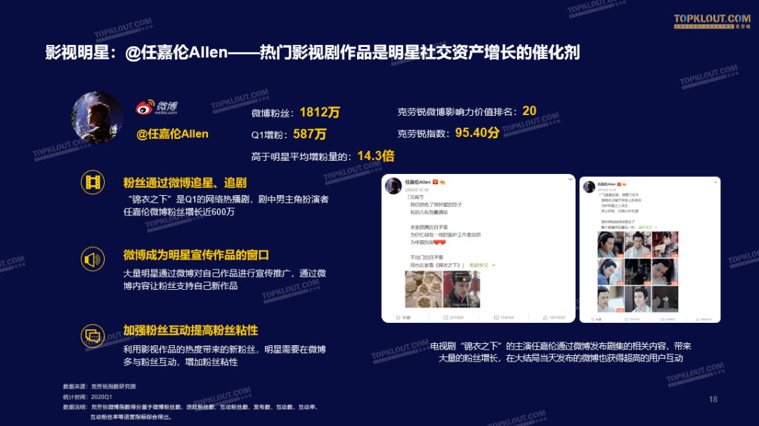 《锦衣之下》是Q1的网络热播剧,剧中男主角扮演者@任嘉伦Allen在Q1微博粉丝增长近600万。任嘉伦也通过微博对自己作品进行宣传推广,通过微博内容让粉丝支持自己新作品。