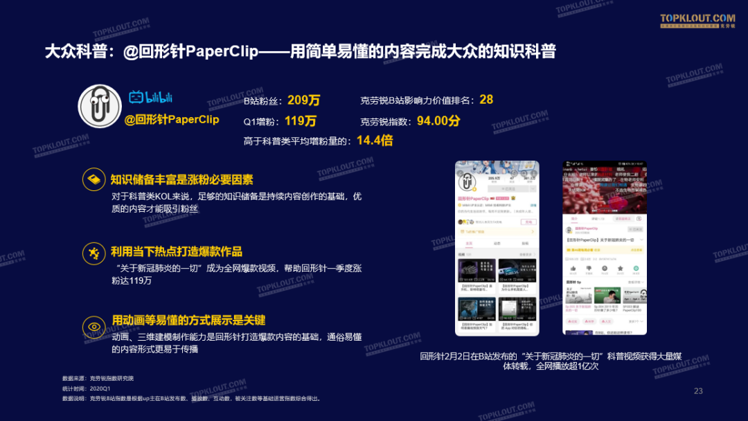 B站科普类KOL@回形针PaperClip的一个“关于新冠肺炎的一切”的科普短视频成为了Q1全网最大的爆款内容。