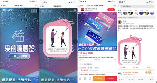 进入H5活动页面后,不难发现点击“爱的暖意签”就会自动生成暖意安心语句,让这波营销走肾又走心。之后,H5界面直接跳转到天猫旗舰店,并自动触发带有品牌信息的博文,在实现销售转化的同时进一步增强声量。
