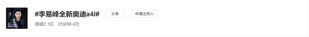 一位明星、三位名人以不同的方式诠释着“做更强大的自己”。话题汇聚数万人在微博上的围观和讨论,有关于自身蜕变心路历程的,有关于全新奥迪A4L的,有关于演员、名人的讨论……最终,#做更强大的自己#阅读量突破6.4亿,同时带动衍生话题#李易峰演讲#、#全新奥迪A4L#、#李易峰全新奥迪A4L#阅读均超2亿。