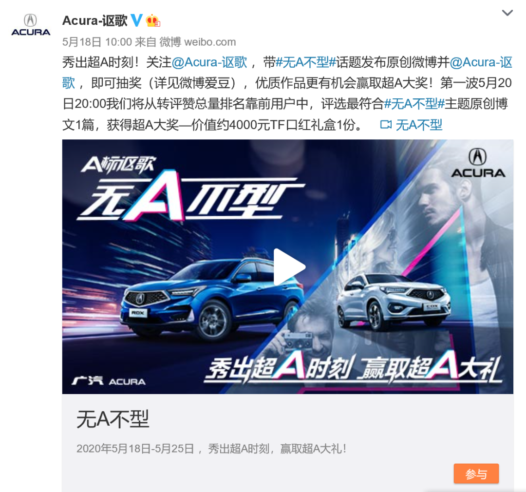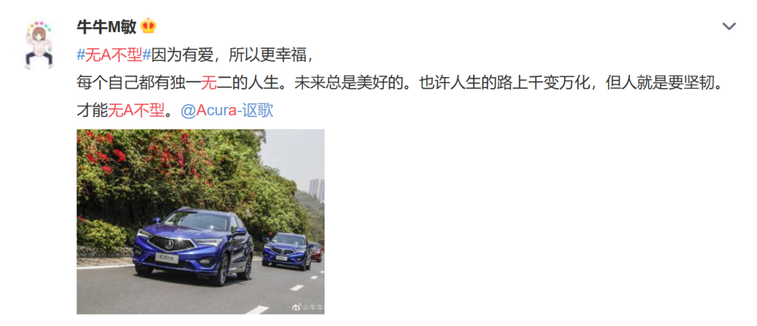 @Acura-讴歌 通过对Z世代年轻人的洞察,贴合其心理在微博推出#无A不型#话题,号召用户带话题发布生活中的超A时刻图文,触达1000万+微博用户。