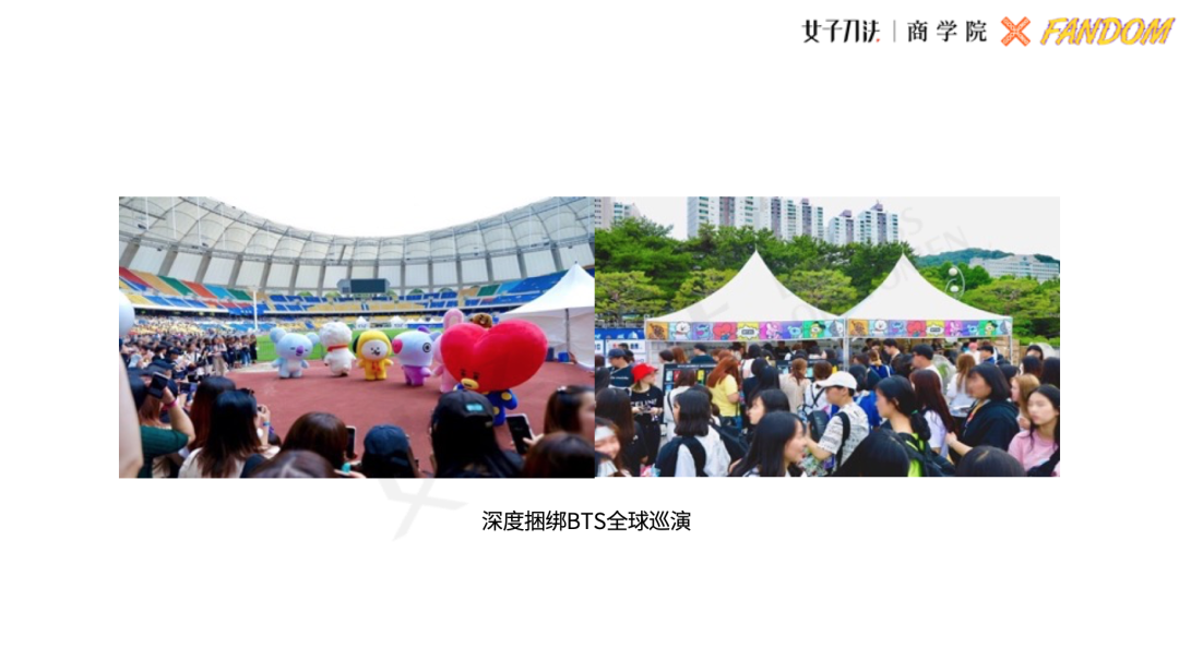 推出联名周边后,其实还有很多可以延展的事情。例如linefriends在线下也搭了很多的店,还会捆绑BTS的全国巡演,定期组织一些活动,只要有这几个玩偶在,还是会造成人山人海的盛况,打造了一个很好的收益,这是非常聪明的合作模式。