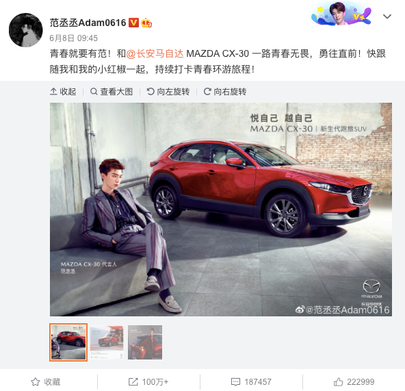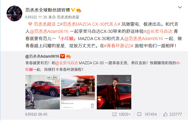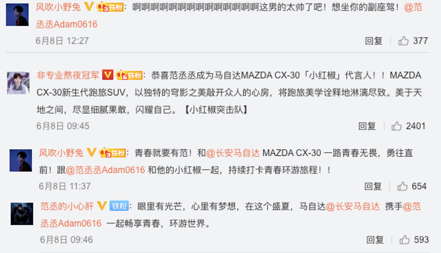范丞丞6月8日,在微博官宣,成为马自达CX-30代言人,引起众多粉丝关注,转发高达100万+,粉丝纷纷表示想坐副驾,打卡青春旅程。
