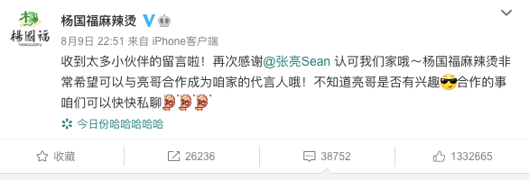 @杨国福麻辣烫 官微也迅速的采取了动作,面对从天而降的“梗”,官微能够及时反应,微博三连,更文发出代言邀请“不知道亮哥是否有兴趣,合作的事咱们可以快快聊”。