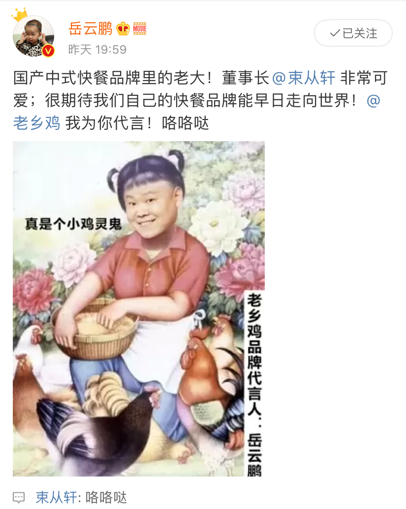 老乡鸡一片痴心打动小岳岳,其中还有网友们的保媒拉纤,也就有了今天的内容:岳云鹏成为老乡鸡代言人,也算是不枉费女王熬夜追年度娱乐大剧——《岳云鹏与老乡鸡的爱恨纠葛》这么久了。