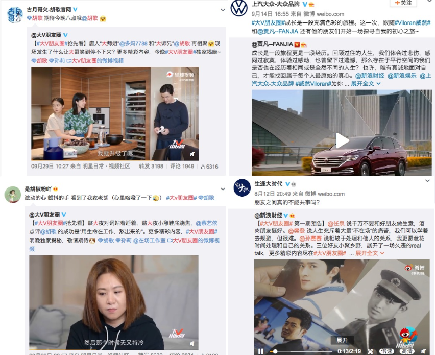 随着节目播出,带动了社交媒体的话题活跃度,话题#大V朋友圈#8月18日在微博上线,《大V朋友圈》官微带话题不断PO出预告片和正片,@新浪财经、@新浪娱乐、@微博明星、@汽车美图等账号矩阵相继为大众威然打call。