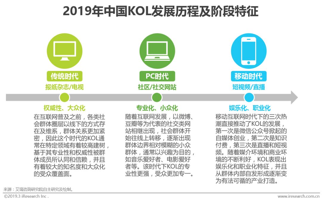 群体意见领袖在人类社会中一直存在,通过KOL展开营销活动触及特定群体的方式也不是互联网时代的产物,但随着媒介技术和媒介环境的发展,KOL概念逐渐从线下群体过渡到线上群体,并且不断衍生出更加丰富的内涵、形式和特征。在传统媒体时代,KOL更多以社会名人的形式存在,基于大众媒介有着较广的影响范围;在PC媒体时代,KOL更多以达人的形式存在,基于社区/社交网络的小众文化圈层发挥着更加专业化的影响力;在移动媒体时代,各类新兴媒体形式层出不穷,KOL的存在形式也愈加多元,职业化和娱乐化成为当前KOL的重要特征。