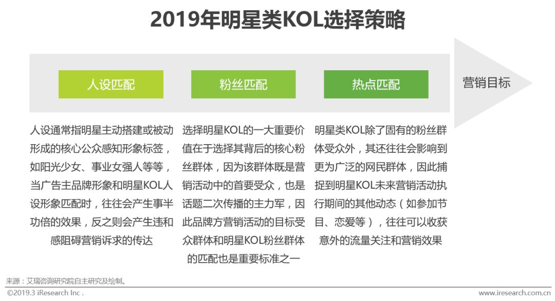 在所有KOL类别中,负责话题引爆的明星类KOL在影响力表现和营销价值最为显著,同时其营销成本和风险性也更高,因此选择合适的明星类KOL显得尤为重要。通常来说,在明星类KOL选择过程中,主要需将营销目标与明星人设、粉丝画像和热点动态三个方面进行匹配,进而筛选出更加合适的明星KOL进行营销合作。值得注意的是,由于明星类KOL在整个营销传播活动中起到关键性作用,因此选择到合适的明星后,后续的媒介选择和策略选择也需要充分考虑明星自身的特征和意愿,进而实现更好的营销效果。