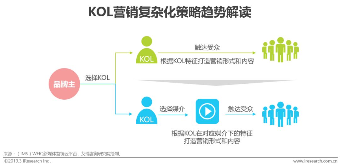 传统KOL营销的关键在于KOL本身,选对KOL也就等于找到了其背后的受众群体,而随着新兴媒介不断涌现,KOL营销策略变得愈加复杂,即使是同一个KOL在不同媒介上的特征和受众也不尽相同。根据(IMS)WEIQ新媒体营销云平台数据显示,2017年IMS(天下秀)合作媒体在直播、短视频、内容电商等新兴媒体类别的订单量占比仅为3%,而2018年该占比上升到11%。因此,未来品牌方在展开KOL营销的过程中,选对KOL也只成功了一半,媒介选择将成为另一半成功关键因素,在整个营销决策中发挥着更加重要的作用。而品牌方在KOL营销中将面临着根据复杂的环境,除了要针对KOL的人设和特征去定制营销形式和内容外,还要充分考虑媒介的特征,以及KOL在不同媒介下的差异化特征等等因素。