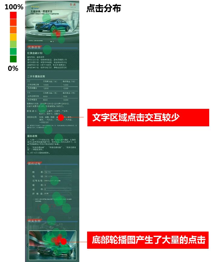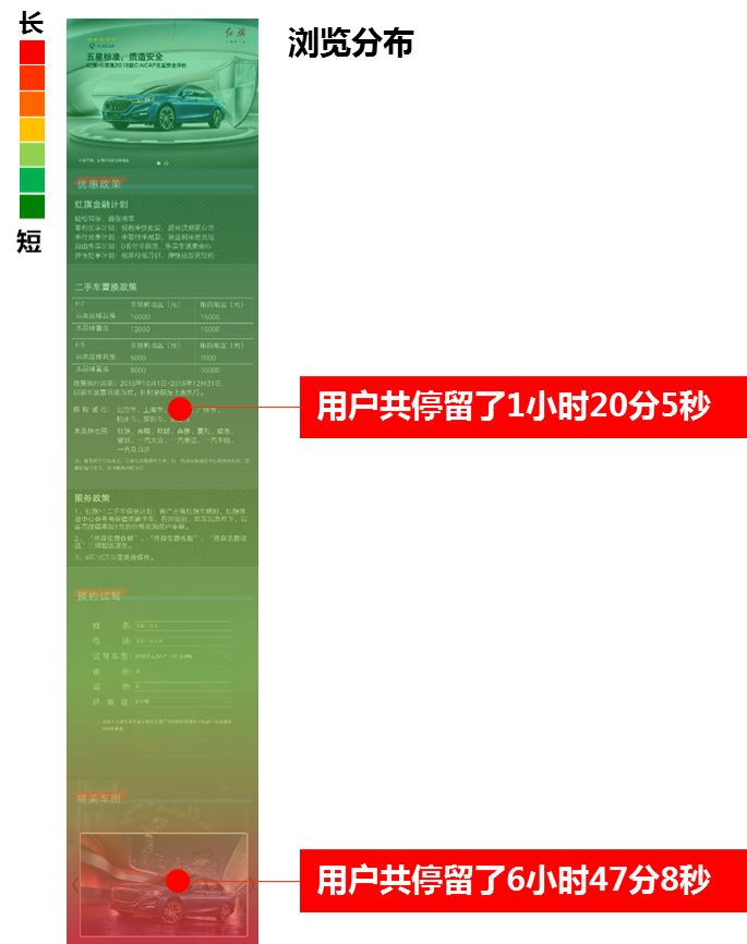 反映的是用户停留时长在落地页上的分布情况,以此衡量用户注意力集中区,便于广告主了解落地页中各交互组件的吸睛情况,进行重点优化。