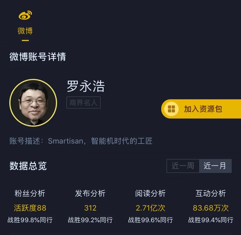 根据克劳锐指数统计近一个月,罗永浩累积发布312条微博,微博互动领先同行99.4%。