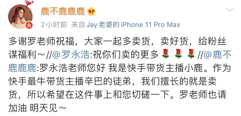 紧接着@鹿不鹿鹿鹿,转发了罗永浩的微博,并表示自己擅长带货,希望在带货这件事上跟罗永浩切磋。