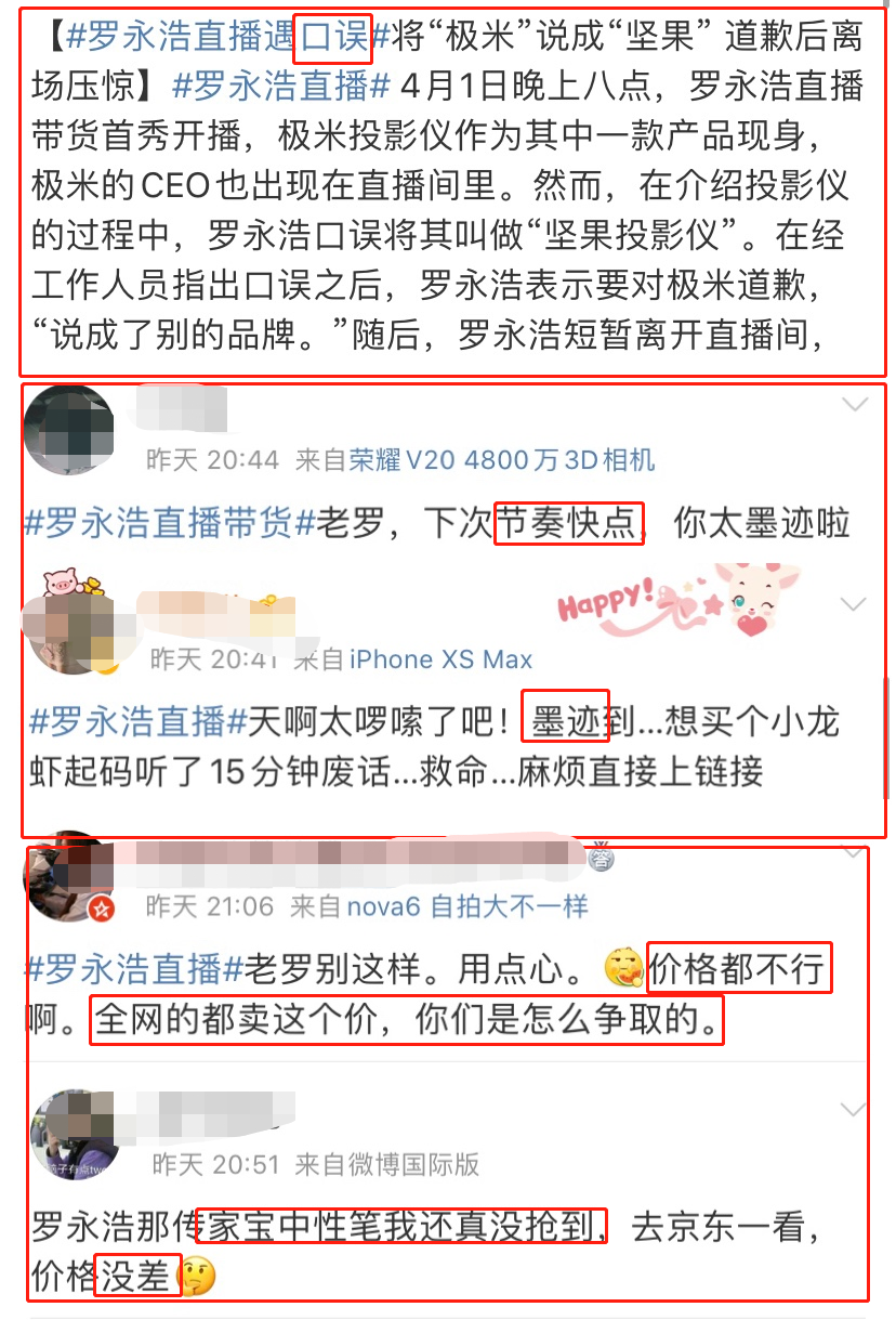 经验不足:初出茅庐的罗老师,也被网友疯狂吐槽,说错品牌名字口误翻车、不了解产品节奏慢、陆续出现“低过老罗”的价格。