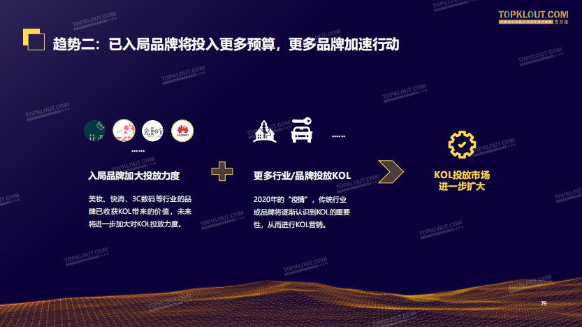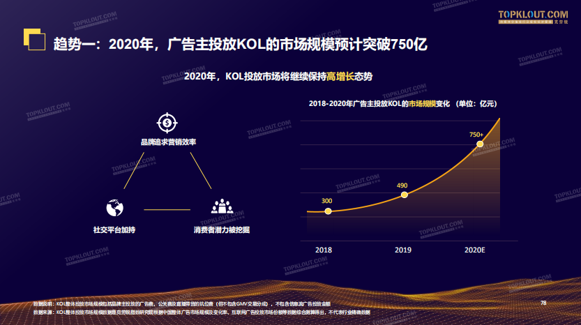 趋势一:受品牌对营销效率的追求、平台扶持及用户潜在消费力被挖掘等因素影响,2020年KOL整体投放将继续保持高增长态势,预计突破750亿元。