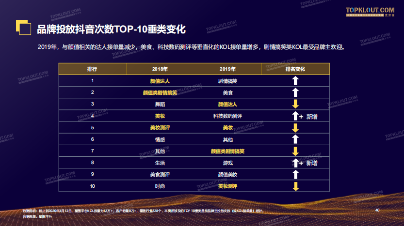 抖音:从KOL的接单情况分析,与颜值相关的达人接单量开始减少,而美食、科技数码测评等垂直化的KOL接单量相对增多,尤其是剧情搞笑类KOL内容创意泛娱乐化,最受品牌主欢迎。基于抖音的算法分发机制,KOL通过优质内容引流,帮助品牌高效曝光并快速“种草”。