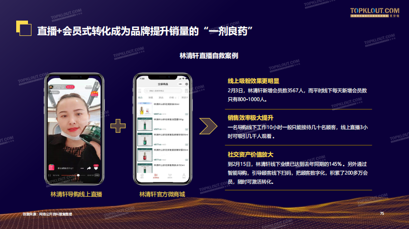 以国产美妆品牌林清轩为例,“疫情”期间通过导购线上直播+微信小程序会员式转化方式成功化解“疫情”危机,截止到2020年2月15日,林清轩线下业绩已达到去年同期的145%。突如其来的场“疫情”,品牌主逐渐意识到数字化建设的重要性。