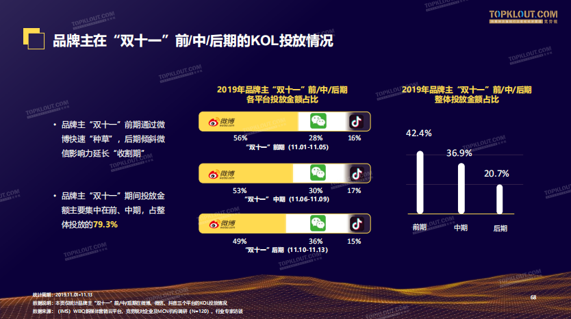 从投放节奏看,品牌主“双十一”期间投放金额主要集中在前、中期,占整体投放的79.3%;从投放平台看,微博是品牌“双十一”期间投放金额比例最大的渠道,品牌主“双十一”前期通过微博进行快速“种草”,后期通过在微信公众号投放品牌公关文稿,延长“收割期”。